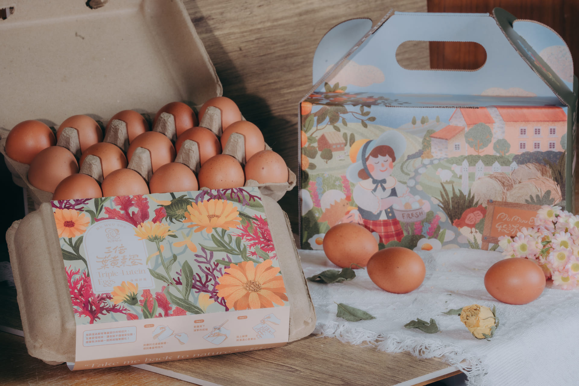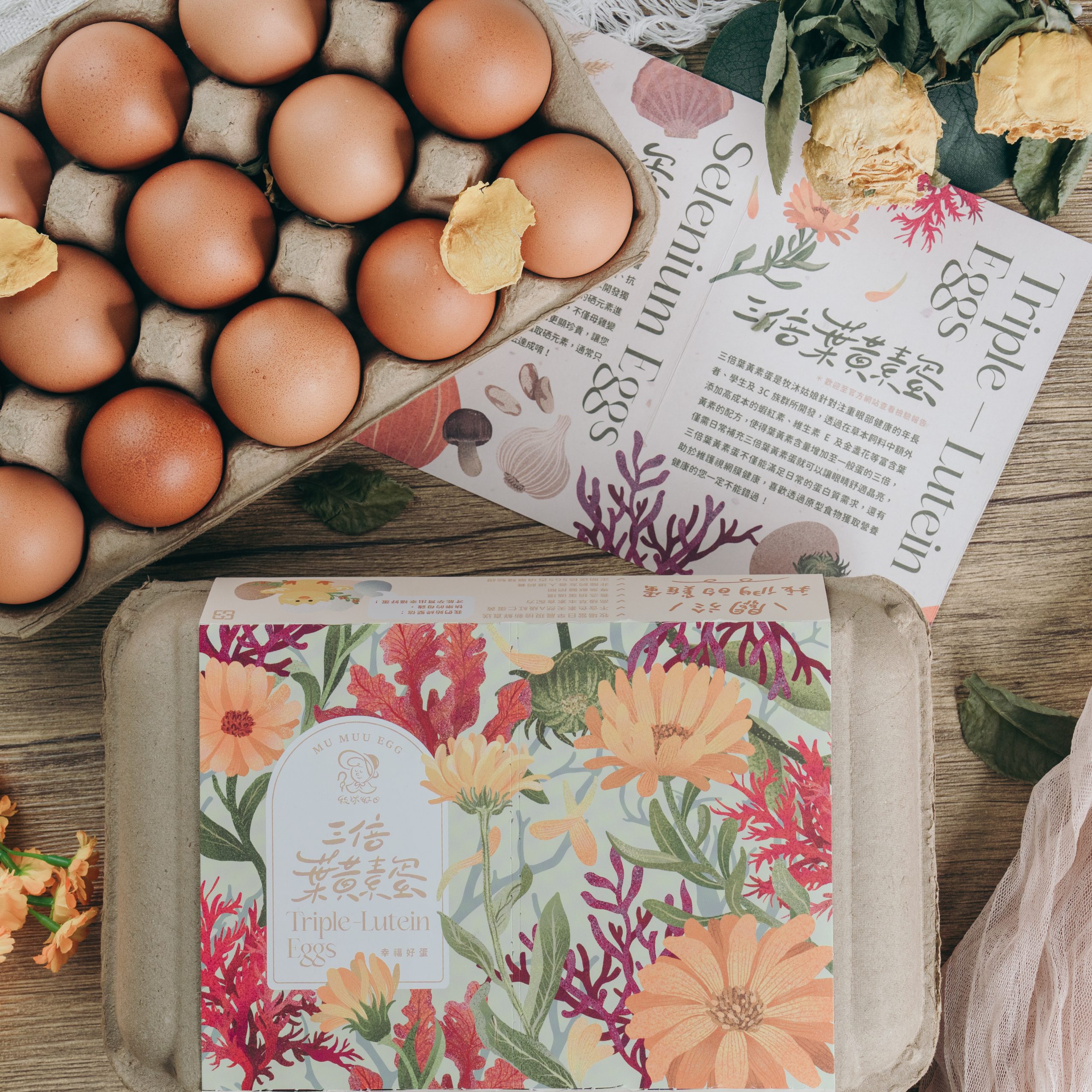 透過在草本飼料中額外添加高成本的蝦紅素、維生素E及金盞花等富含葉黃素的配方,使得葉黃素含量增加至一般蛋的三倍
